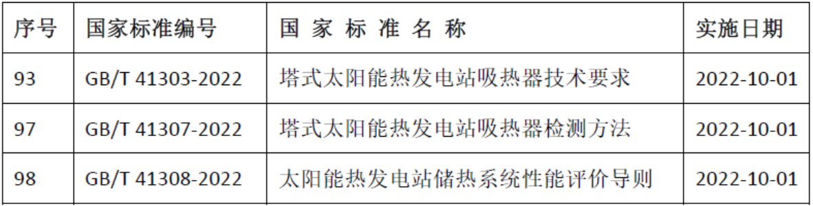 3月9日,国家市场监管总局、国家标准化管理委员会发布《中华人民共和国国家标准公告(2022年第2号)》,公告批准发布了357项推荐性国家标准和4项国家标准修改单。其中,《塔式太阳能热发电站吸热器技术要求》《塔式太阳能热发电站吸热器检测方法》和《太阳能热发电站储热系统性能评价导则》三项太阳能光热电站国家标准,均于2022年10月1日实施。