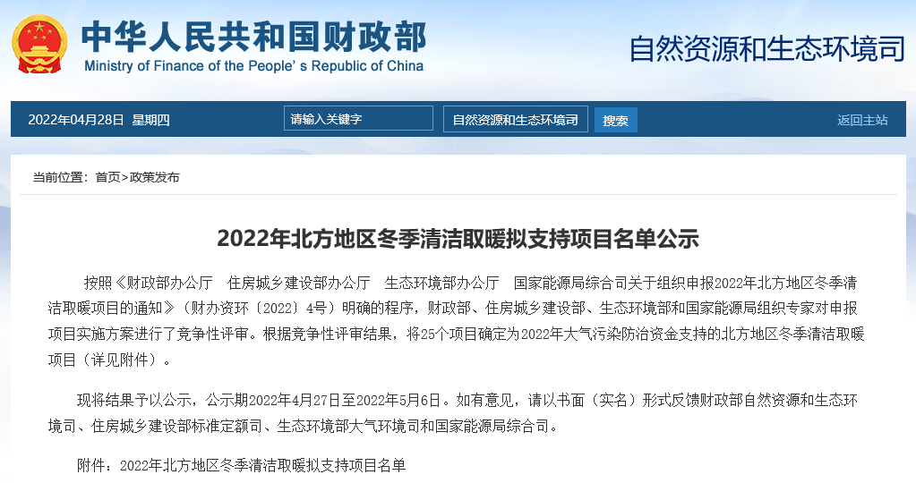 2022年4月27日,财政部等四部门联合发布《2022年北方地区冬季清洁取暖拟支持项目名单公示》,将25个项目确定为2022年大气污染防治资金支持的北方地区冬季清洁取暖项目。