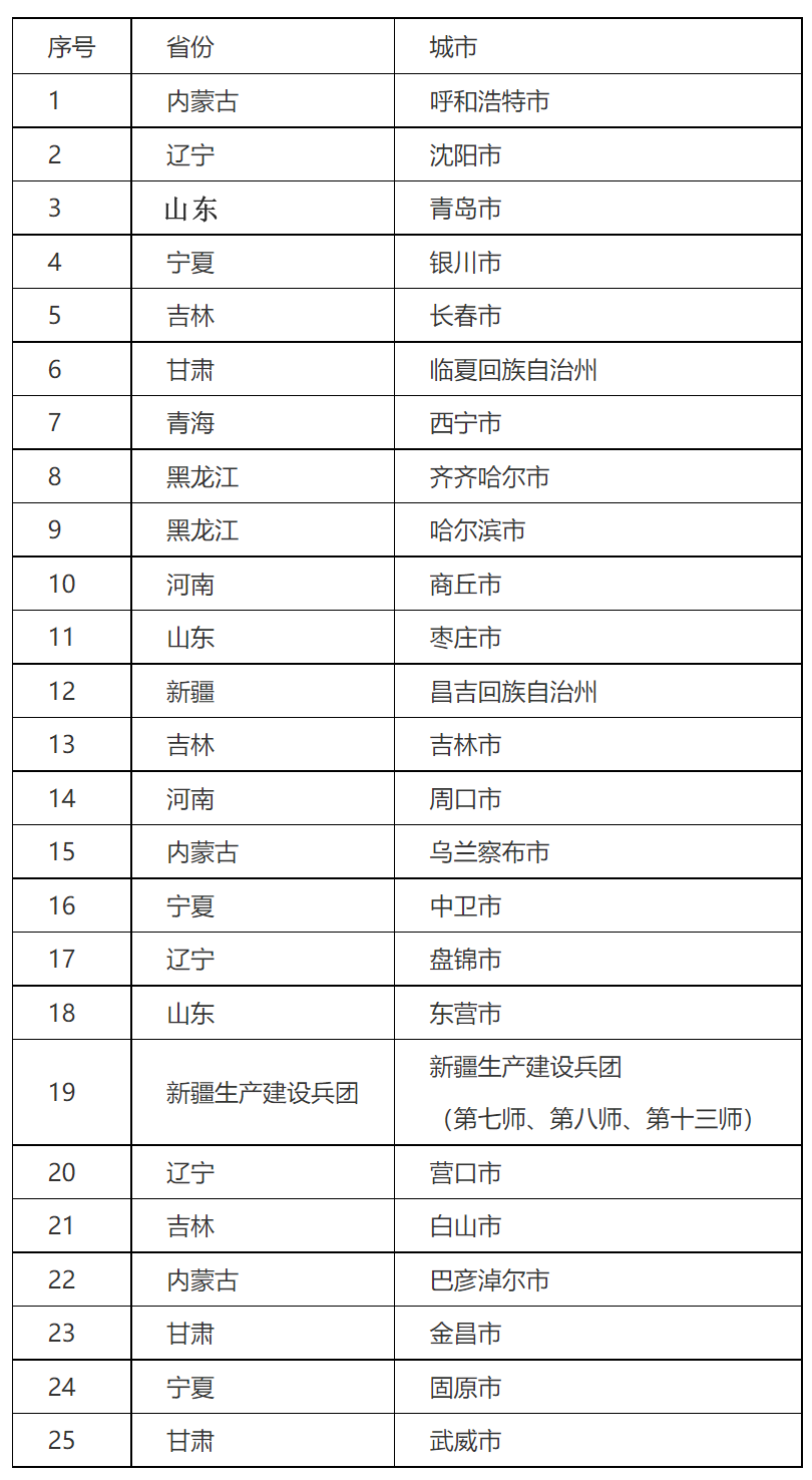 25个项目城市为:呼和浩特市、沈阳市、青岛市、银川市、长春市、临夏回族自治州、西宁市、齐齐哈尔市、哈尔滨市、商丘市、枣庄市、昌吉回族自治州、吉林市、周口市、乌兰察布市、中卫市、盘锦市、东营市、新疆生产建设兵团(第七师、第八师、第十三师)、营口市、白山市、巴彦淖尔市、金昌市、固原市、武威市。加上2017-2021年已纳入中央财政冬季清洁取暖试点的63个城市,总支持城市数量达到88个。