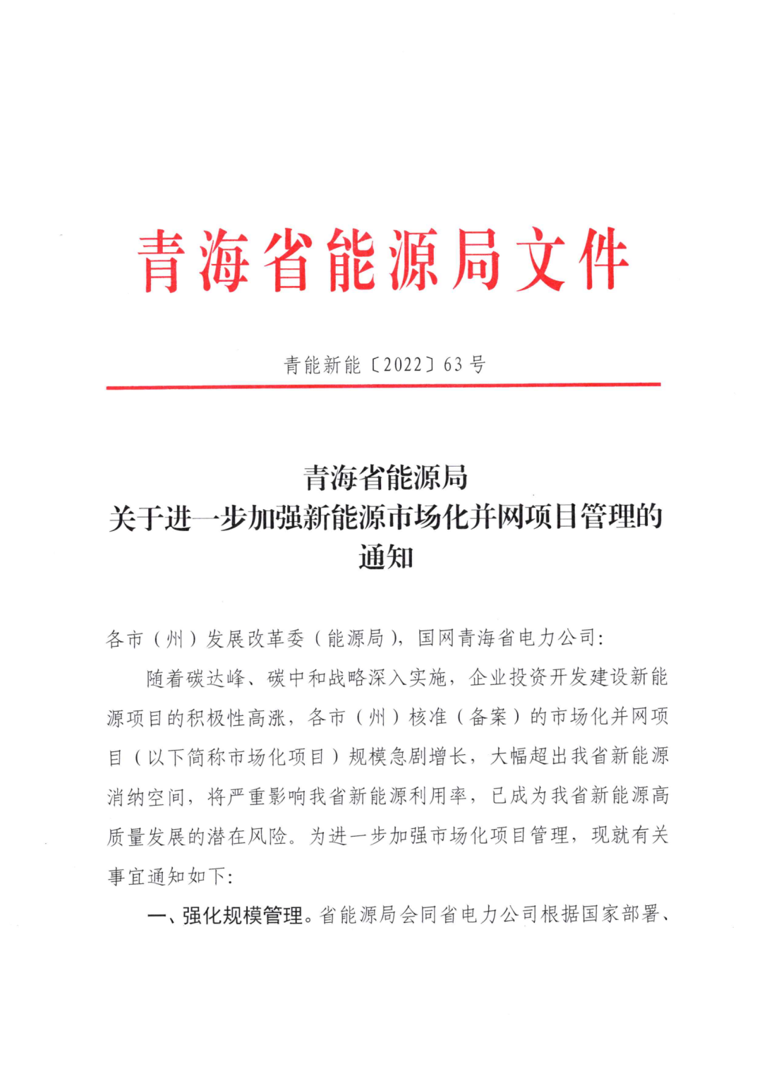 近日,青海省能源局印发《关于进一步加强新能源市场化并网项目管理的通知》。《通知》表示,各市州核准备案的市场化并网规模急剧增长,严重超出我省新能源消纳空间,将严重影响我省新能源利用率。为进一步加强市场化项目管理,省能源局会同省电力公司根据国家部署、省级规划目标,以全省新能源合理利用率水平为依据,每年年初测算确定各市(州)当年市场化项目发展规模、结构及配套消纳条件,各市(州)发展规模不得超过上述规模。
