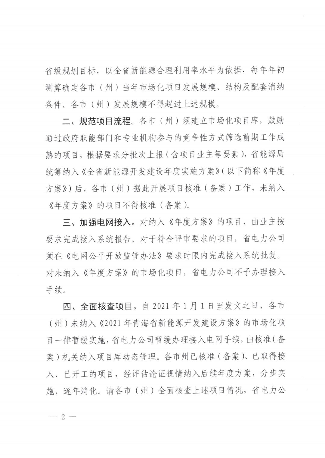 《通知》指出,各市(州)须建立市场化项目库,未接入《年度方案》的项目不得核准(备案);省电力公司不予办理接入手续;自2021年1月1日发文之日,各市(州)未纳入《2021年青海省新能源开发建设方案》的市场化项目一律暂缓实施,省电力公司暂缓办理接入电网手续,由核准(备案)机关纳入项目库动态管理。各市(州)已核准(备案)、已取得接入、已开工项目、经评估论证视情况纳入后续年度方案,分步实施、逐年消化。
