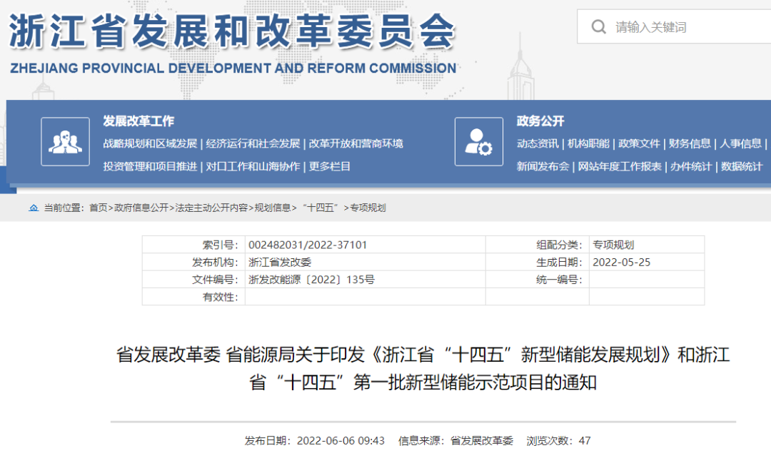 6月6日,浙江省发展改革委、省能源局联合印发《浙江省“十四五”新型储能发展规划》(简称《规划》)和浙江省“十四五”第一批新型储能示范项目的通知。