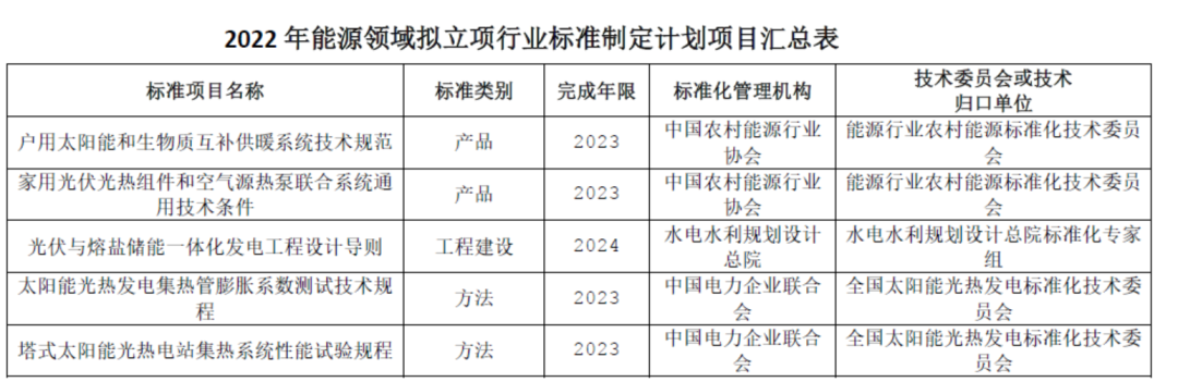 7月22日,国家能源局综合司发布《关于公开征求2022年能源领域拟立项行业标准制修订计划及外文版翻译计划项目意见的通知》。其中,太阳能热利用及熔盐储能相关的行业标准如下图所示: