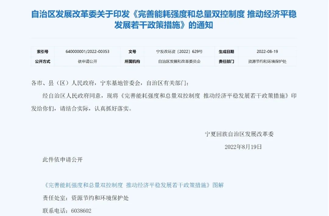 8月23日,宁夏回族自治区发改委印发《完善能耗强度和总量双控制度推动经济平稳发展若干政策措施》,措施对对能耗双控评价考核方式进行了调整。统筹考虑经济形势及跨周期因素,优化对各地区能耗双控考核频次,实行“年度评价、中期评估、五年考核”,并将考核结果作为对领导班子和领导干部综合考核评价的重要依据。
