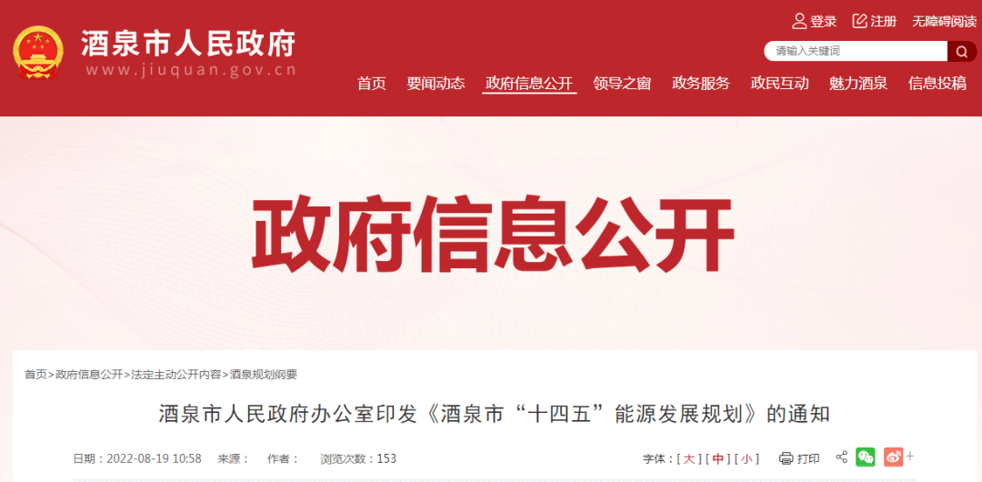 近日,酒泉市人民政府办公室对外印发《酒泉市“十四五”能源发展规划》的通知,文件指出,以新能源为引领,带动装备技术研发,做强风电、光伏、光热、储能、氢能、智慧电网六大新能源装备制造产业链,打造新能源装备研发高地、新技术新产品试验平台和发布基地。加快建设火电、光热、燃气发电、抽水蓄能、氢储能等调峰项目,着力提升调峰能力,为早日实现区域碳达峰奠定基础。