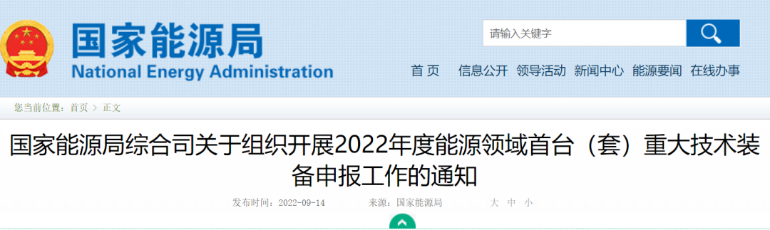 9月14日,国家能源局综合司发布《关于组织开展2022年度能源领域首台(套)重大技术装备申报工作的通知》。