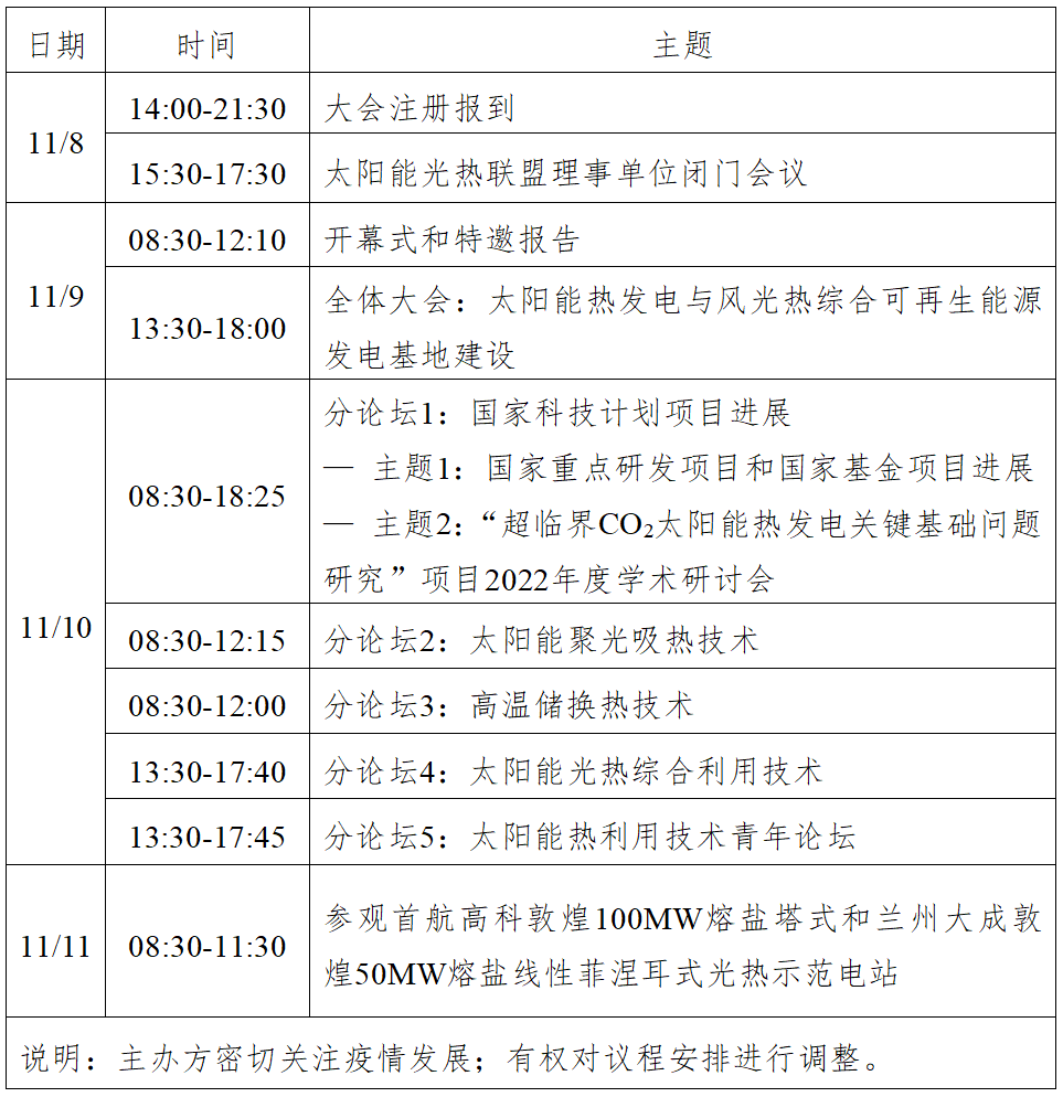 、中国工程热物理学会、中国可再生能源学会、中国电机工程学会、首航高科能源技术股份有限公司共同主办,中国能源建设股份有限公司西北区域总部、中国电力工程顾问集团西北电力设计院有限公司、浙江可胜技术股份有限公司联合协办的2022中国太阳能热发电大会拟于11月9日~10日(11月8日报到,11月11日电站参观)召开。大会拟定日程如下: