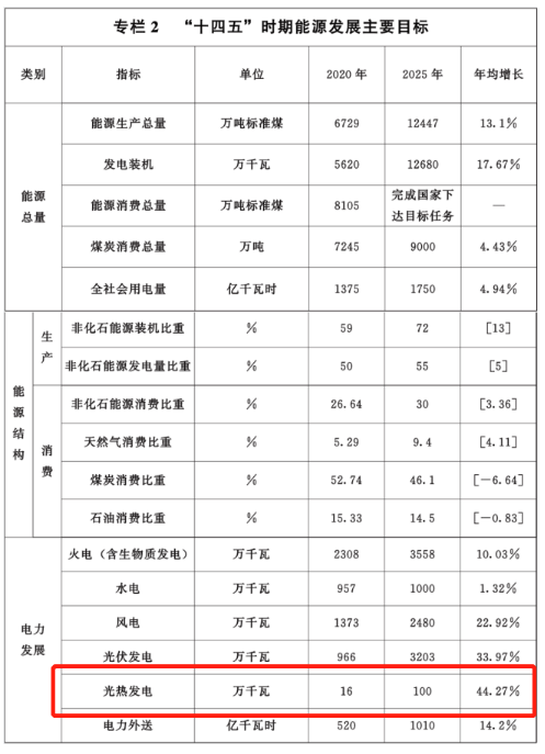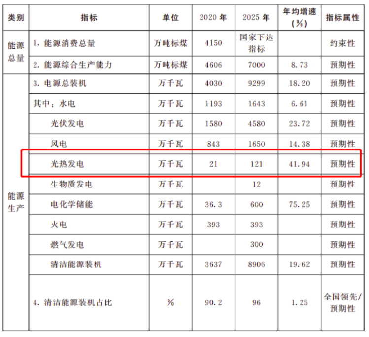 《规划》指出要统筹推进风光热协调发展,推进太阳能光热发电与风光电协同发展。以太阳能光热电站的应用和示范项目为基础,推进太阳能光热电站的发展和研究,探索太阳能光热发电技术,增加系统调峰能力,提升新能源消纳水平,提高太阳能光热发电的经济性,为今后规模化发展太阳能光热电站、打造更大规模新能源基地奠定基础。到2025年,光热项目新增装机规模20万千瓦。