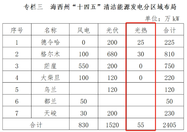 重点提及光热发电,并指出十四五时期海西州将发挥光热发电灵活调节、电网支撑和促进新能源消纳的优势,推动成为新的基荷电源和调峰电源。十四五时期,海西州计划示范性发展光热发电,示范性扩展光热发电规模,新增容量55万kW【注:该数据与青海省级规划有出入,以实际落地为准】。