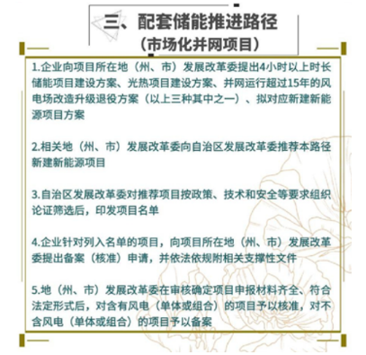文件指出,该路径基于《国家发展改革委国家能源局关于鼓励可再生能源发电企业自建或购买调峰能力增加并网规模的通知》(发改运行〔2021〕1138号)文件精神:超过电网企业保障性并网以外的规模,按照20%(时长4小时)以上比例配建调峰能力的优先并网;自建合建调峰和储能能力按照“企业承诺、政府备案、过程核查、假一罚二”的原则进行确定。