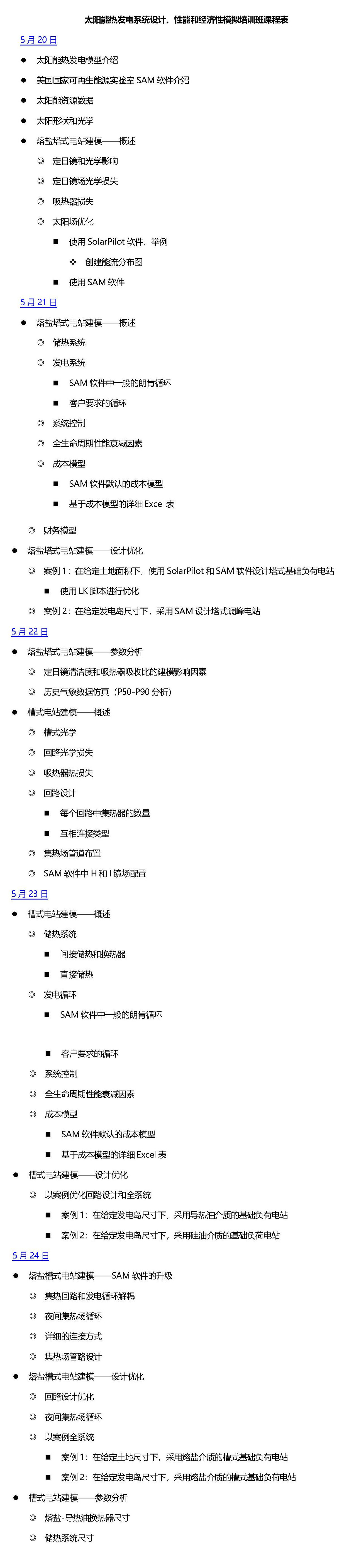 将于2019年5月20-24日在北京(中国科学院电工研究所)举办为期5天的太阳能热发电系统设计、性能和经济性模拟深度培训班。本次培训班主讲人为SolarDynamics 公司的高级流程和系统工程师Kyle Kattke,他曾在Abengoa Solar 美国公司工作了5年,在商业化熔盐塔式和槽式光热电站方面具有丰富的设计经验。辅助讲师和翻译为Solar Dynamics系统分析师吴康乾,他曾参与了美国280MW Solana和250MW Mojave两个槽式光热电站的银行担保模型及性能模型的开发。培训班期间将进行实际电脑操作。培训班结束后,还将组织前往中国科学院电工研究所北京延庆太阳能热发电实验基地,现场观摩1MW塔式和槽式电站。