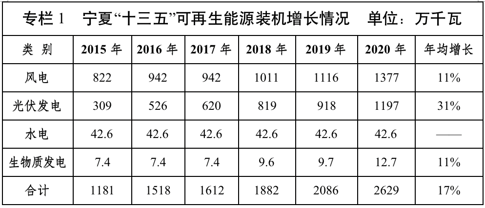 专栏1宁夏“十三五”可再生能源装机增长情况单位:万千瓦