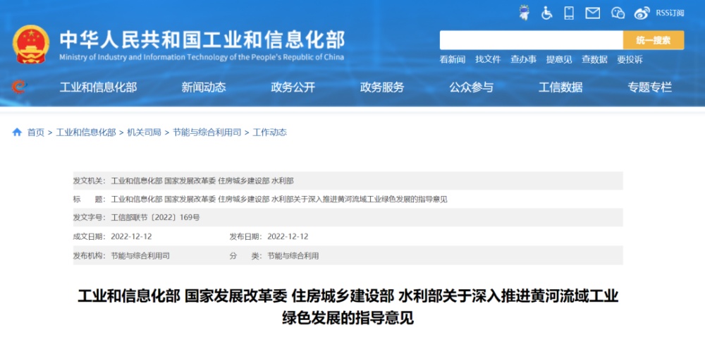 12月12日,工业和信息化部、国家发展改革委、住房城乡建设部、水利部四部门联合发布关于深入推进黄河流域工业绿色发展指导意见文件,文中明确指出: