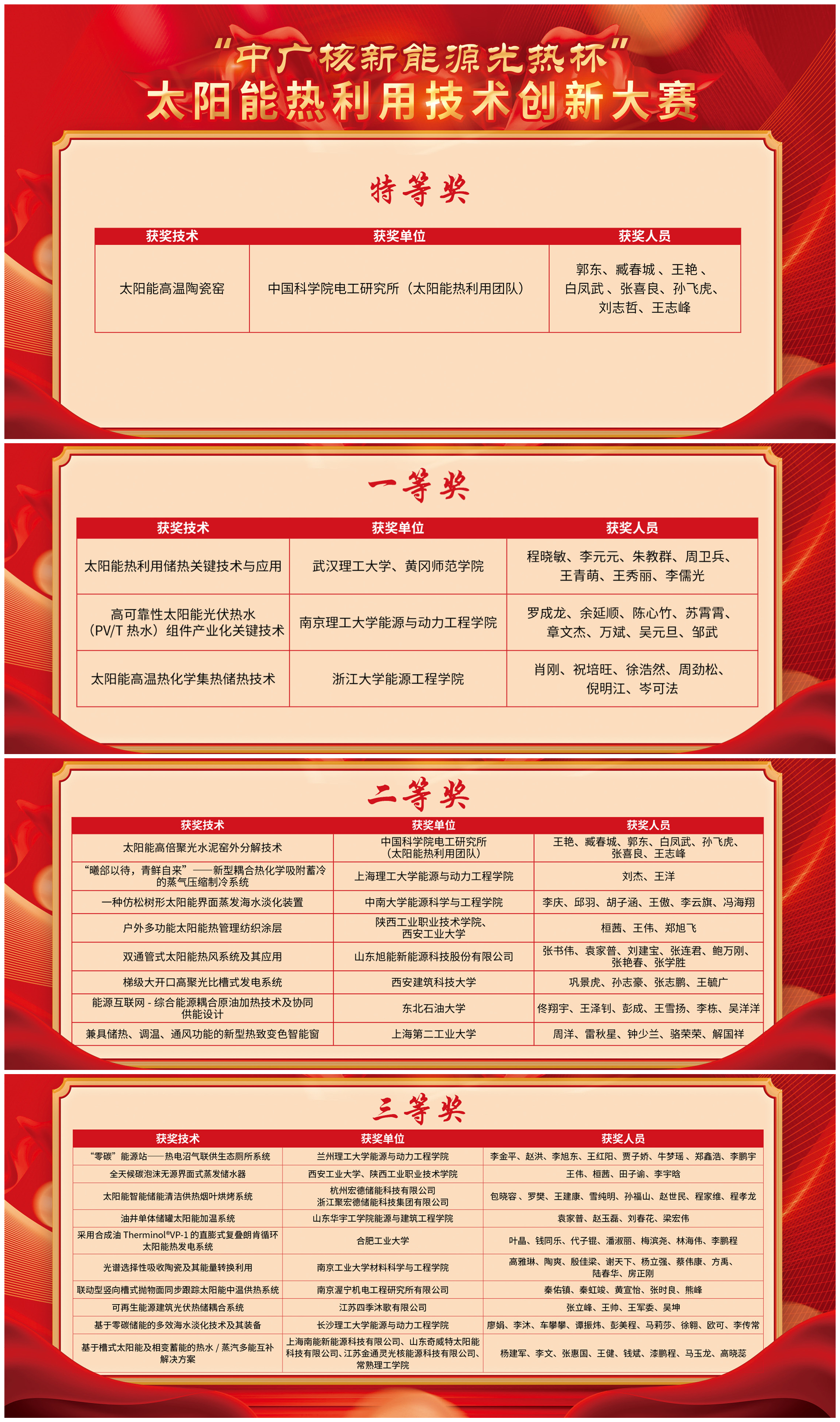 12 月23 日,由太阳能光热联盟和国家能源太阳能热发电技术研发中心共同主办,中国广核新能源控股有限公司承办的“中广核新能源光热杯”太阳能热利用技术创新大赛颁奖典礼成功举行。第十九届、二十届中央委员会候补委员、中国科学院何雅玲院士宣布了22个获奖团队名单。其中,中国科学院电工研究所太阳能热利用团队“太阳能高温陶瓷窑”技术荣获特等奖。