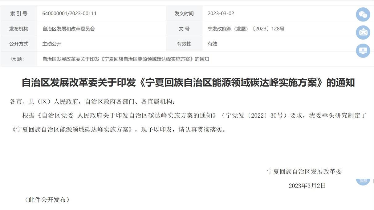 3月2日,宁夏回族自治区发展改革委印发《宁夏回族自治区能源领域碳达峰实施方案》。
