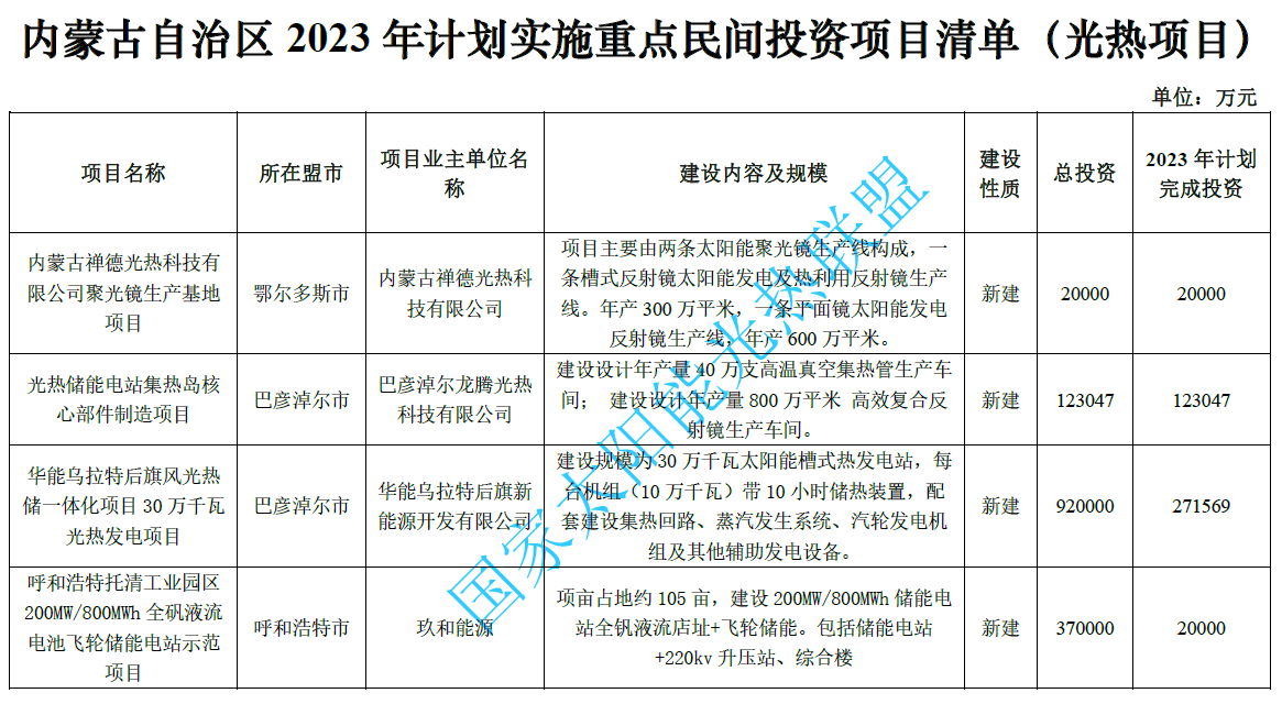 3月27日,内蒙古自治区发展和改革委员会印发《关于全力推进全区2023年重点民间投资项目落地实施工作的通知》(内发改投字〔2023〕305号),2023年拟推进实施的2617个重点民间投资项目清单,年度计划完成投资4069.5亿元。其中包括3个光热项目,1个飞轮储能项目。