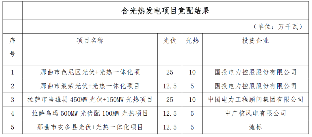 据悉,西藏自治区2023年新能源竞配工作已完成。其中,35万千瓦光热发电装机保障性指标中,国投电力获得15万千瓦,中国能建10万千瓦,中广核5万千瓦;那曲县含5万千瓦光热发电项目流标,现已发布第二次竞标磋商公告,详情可见:2024年10月建成,那曲5万千瓦光热项目竞争性配置(二次)磋商公告