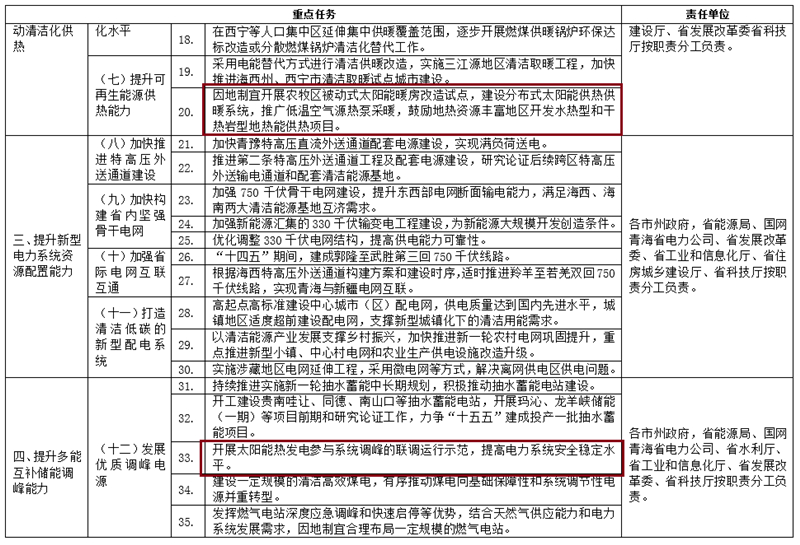 (十)提升可再生能源供热能力。采用电能替代方式进行清洁供暖改造,实施三江源地区清洁取暖工程,加快推进海西州、西宁市清洁取暖试点城市建设。因地制宜开展农牧区被动式太阳能暖房改造试点,建设分布式太阳能供热供暖系统,推广低温空气源热泵采暖,鼓励地热资源丰富地区开发水热型和干热岩型地热能供热项目。