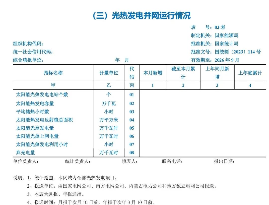 11月14日,国家能源局印发《可再生能源利用统计调查制度》的通知。其中,涉及光热发电并网运行情况。