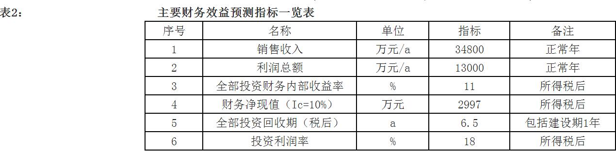 项目达产后,年销售收入34800万元,利润13000万元,投资回收期6.5年(税后,含建设期1年),投资利润率18%。