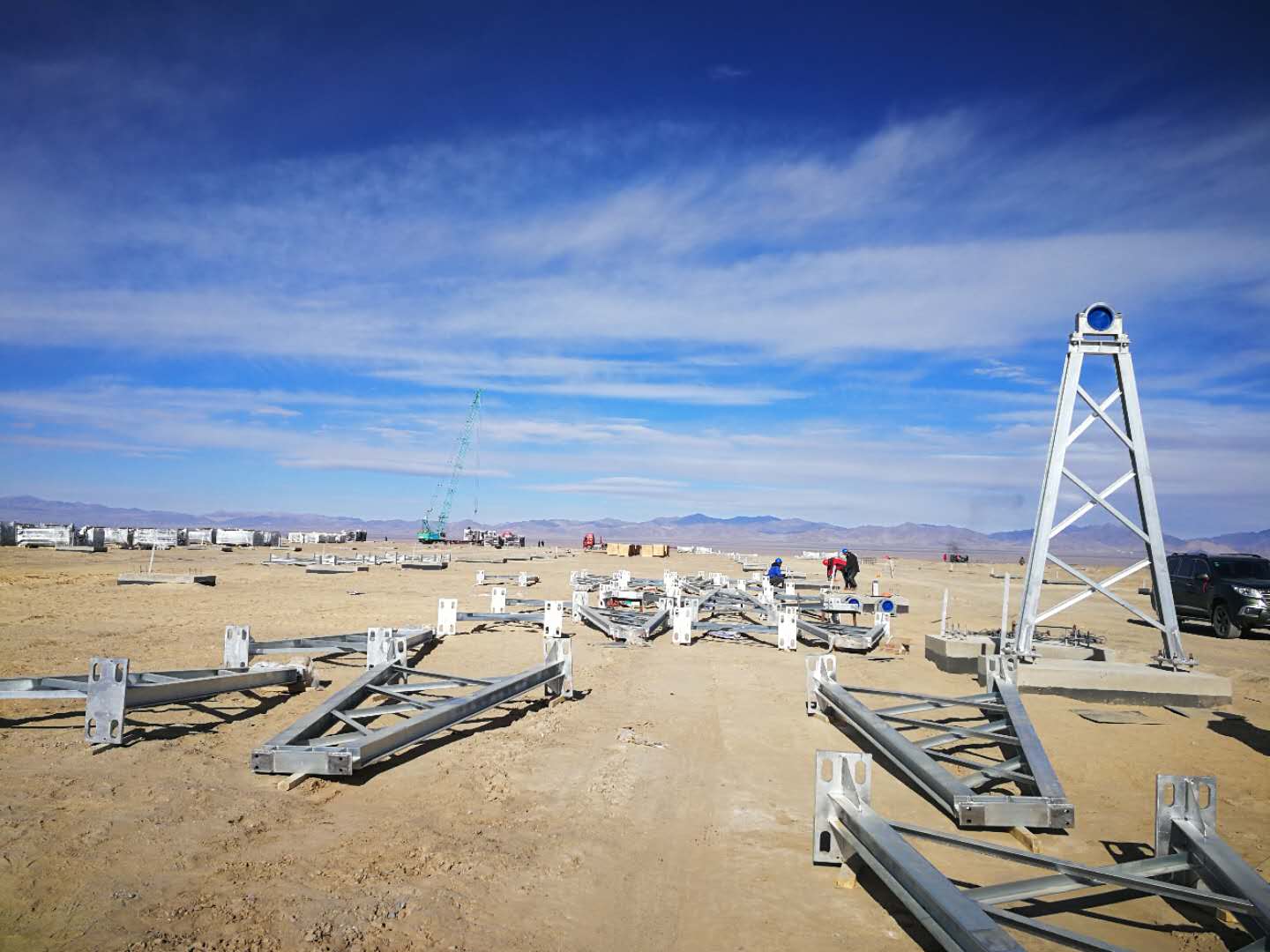 近日,深圳金钒阿克塞50MW槽式熔盐光热发电项目集热场支架开始安装。这是施工方采取冬季施工保暖措施和24小时开展不间断施工作业又一进展。该项目目前完成组装车间基础建设,正在进行钢结构主体安装和室内外地平硬化;集热场桩基工程已完工;厂区场平基础放坡施工、蓄水池基础开挖、基础浇筑以及储热罐基础浇筑以及水、电等各项工程正在有序推进。