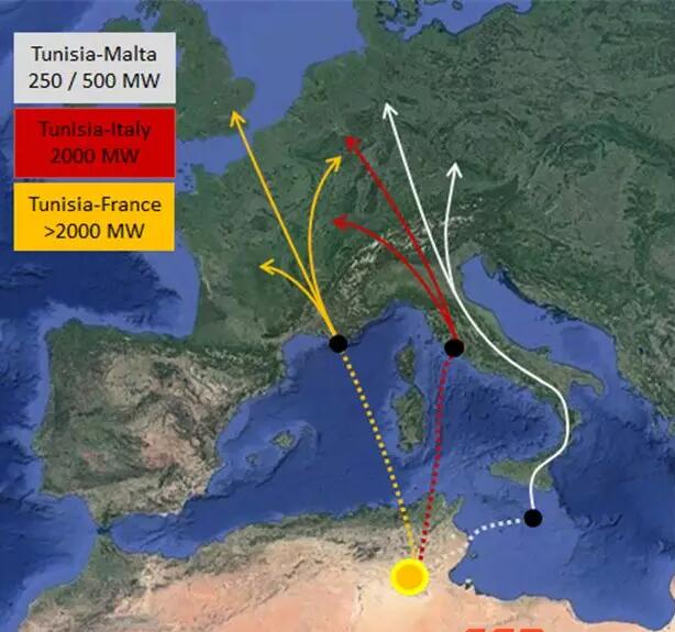 据报道,2017年8月份该项目开发商英国Nur Energie公司向突尼斯政府提出在撒哈拉沙漠边缘建设总装机规模4.5GW左右大型光热电站的申请。按照规划,该项目将设三条输电路径,分别连接马耳他(装机500MW,分两期建设)、意大利(总装机2GW)和法国(总装机超2GW)。