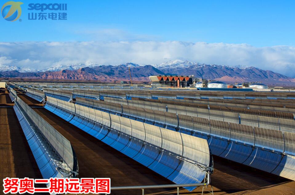 Noor电站是全球在建规模最大的太阳能槽式、塔式混合光热电站项目,总装机达510MW,一期项目NOORI采用槽式技术,装机160MW,2013年动工,于2015年11月并网投运,目前正在为约40万居民输送电力。NOORII槽式光热电站,装机200MW,NOORIII则采用塔式技术开发,装机150MW,塔高225米。NOORII&III两个项目采用同步建设,协同运营的开发模式,以最大程度地发挥其联合优势。Noor项目整体建成后,预计年可减排二氧化碳约70万吨。