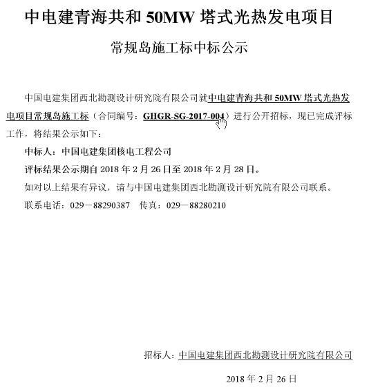 附:中电建青海共各50MW塔式光热发电项目常规岛施工标中标公示