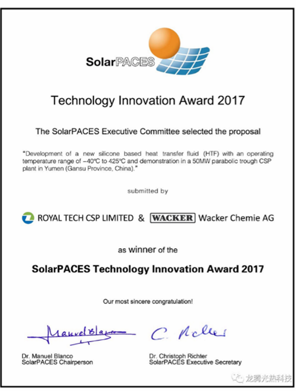 硅油运行温区的扩展,将会显著降低投资,提升发电量,提高电站项目生命周期内整体经济性。新型硅油应用也得到了国际CSP业界的一致肯定,获得Solar PACES 2017技术创新奖,硅油应用于槽式电站也是全球光热发电发展进程中的一项重大技术创新与突破,将引领国际槽式技术发展的方向,推动槽式技术的发展。