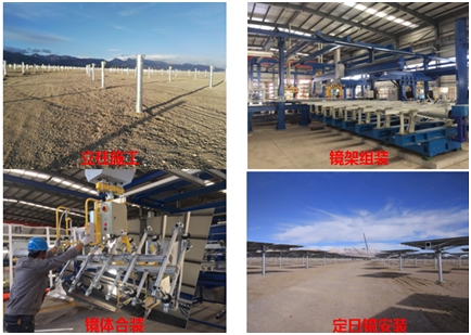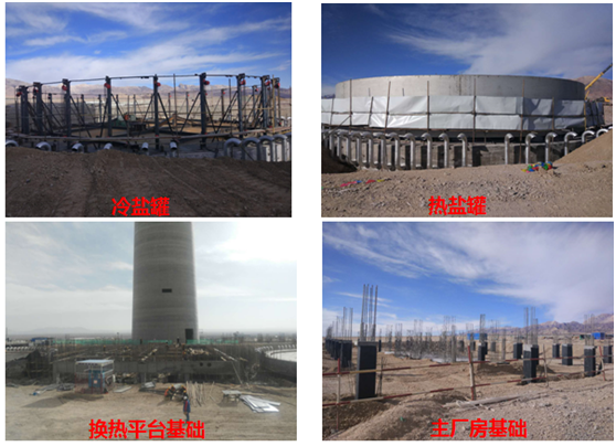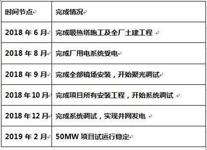 目前,项目整体工程进度基本按照进度计划进行。因冬季气候原因,项目各项现场施工于2017年11月份至2018年1月份陆续暂停,目前已经全面复工。定日镜场已完成定日镜立柱安装7200套,定日镜累计安装近6000面;吸热塔已浇筑至100米;主厂房已完成基础施工以及土方回填;熔盐储罐已完成冷、热盐罐的基础施工、底板焊接、以及热盐罐的拱顶和第六圈板焊接;换热系统已完成换热系统平台及泵平台基础施工及土方回填。