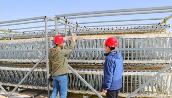 图:甘肃光热发电有限公司工程技术人员正在检查刚刚到货的聚光器支架