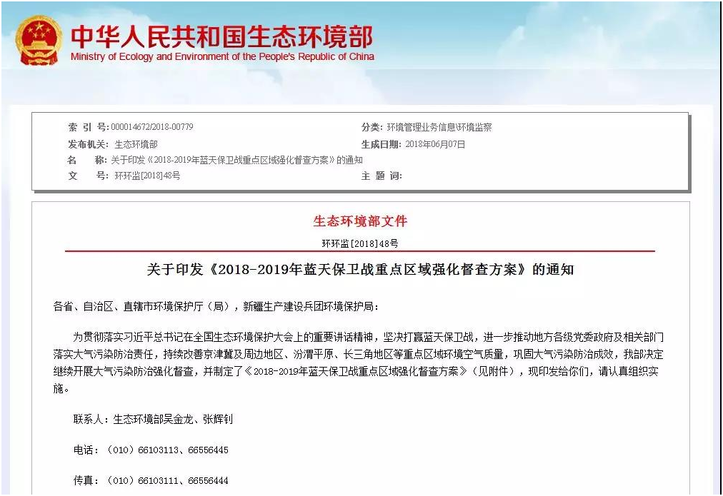 2018年6月7日,生态环境部印发《2018-2019年蓝天保卫战重点区域强化督查方案》,提出坚决打赢蓝天保卫战,2018年以“2+26”及汾渭平原11个冬季清洁取暖城市及燃煤替代为重点,督查是否制定本年度清洁取暖及燃煤替代清单,以乡镇(街道)为单位,逐村入户抽查各项工作落实情况;列入清单的乡镇(街道)是否按要求杜绝散煤燃烧;对照上年度清单,抽查已完成清洁取暖或燃煤替代的地区是否存在散煤复烧的情况。