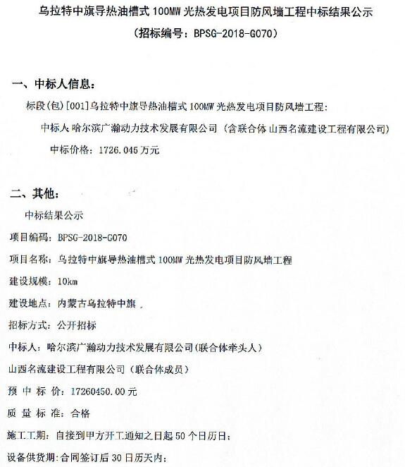 附:乌拉特中旗导热油槽式100MW光热发电项目防风墙工程中标结果公示