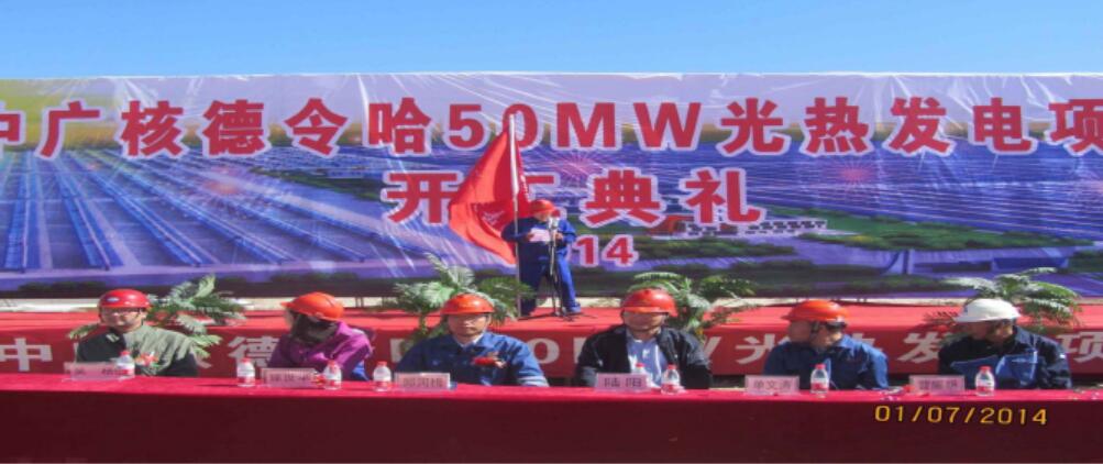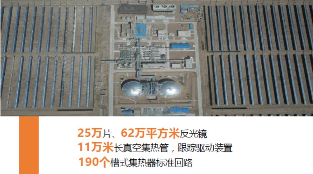 中广核德令哈50MW槽式光热发电示范项目总投资17亿元,项目位于青海省海西蒙古族藏族自治州德令哈市的戈壁滩上,占地2.46平方公里,采用了导热油槽式技术,配套9小时熔融盐储热,由太阳岛、热传及蒸汽发生系统、储热岛、发电岛四大部分组成。