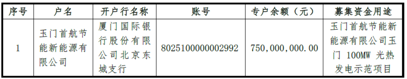 北京首航艾启威节能技术股份有限公司(下文简称首航节能)11月30日发布《关于签订募集资金三方监管协议的公告》,公告称,公司于2018年9月18日、2018年10月8日分别召开第三届董事会第二十四次会议及2018年第二次临时股东大会,审议通过了《关于变更部分募集资金投资项目的议案》,同意将募集资金75,000万元用于玉门首航节能新能源有限公司(以下简称“玉门新能源”)玉门100MW光热发电示范项目,并由玉门新能源开设新的募集资金专户。