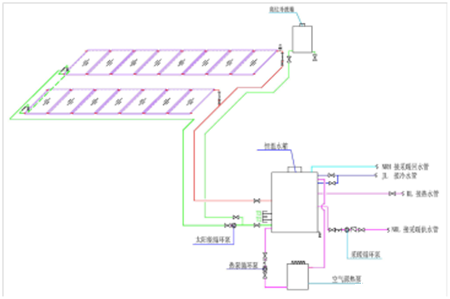 图:平板集热器耦合热泵供暖系统原理图