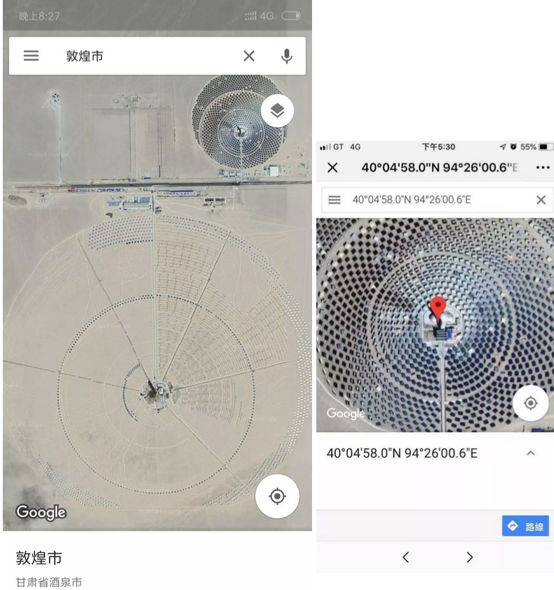 首航节能敦煌100兆瓦熔盐塔式光热发电站位于敦煌市七里镇光电产业园,占地800公顷,这是全球聚光规模最大、吸热塔最高、储热罐最大、可24小时连续发电的100兆瓦级熔盐塔式光热电站,标志着中国成为世界上少数掌握百兆瓦级光热电站技术的国家之一。该电站特别之处就是使用“镜子”,由 53375片镜子组成的1525面定日镜围绕吸热塔进行环形布置,镜场面积140万平方米,可从Google Map卫星定位图中看见其之壮观。