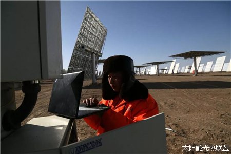 图:首航节能敦煌100兆瓦熔盐塔式光热电站,工作人员在检修设备