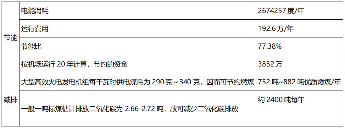 泸沽湖机场于2015年10月12日建成通航,当年10月20日开始启用供暖系统,第一期供暖自2015年10月20日至2016年3月31日,共6个月,供暖期间航站楼等大空间温度维持在18摄氏度,生活办公区维持在22摄氏度。第一个采暖期实际用电量632340.6度,泸沽湖机场用电0.7202元/度,总电费455411.7元,对照原设计“太阳能+电热锅炉”工艺电费需要180万元/年,即每年节约电费约134.46万元,太阳能+地源热泵的方案较原设计增加的建设投资只需6至7年时间就可收回,投资效果显著。