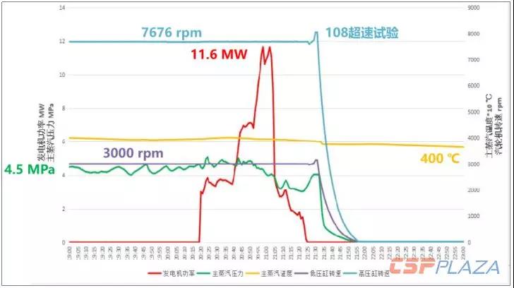 下图为该项目于2018年12月30日并网发电当天的相关数据:总发电时间为1.1个小时,最高发电功率为11.6MW。红色代表汽轮机功率,蓝色代表高压缸转速(超过3000转),紫色代表低压缸转速,绿色代表主蒸汽压力(熔盐温度400℃)。