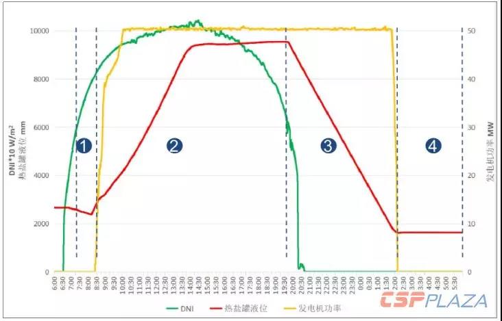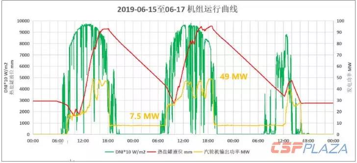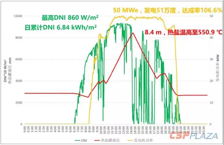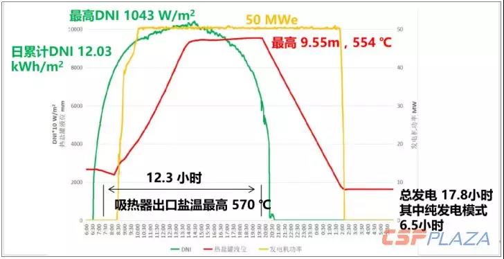 当天90%以上的负荷(≥45MW)发电时长达16.1小时,吸热器最高温度达到570℃,热盐液位最高达9.55m,当天日累计DNI为12.03kWh/㎡。
