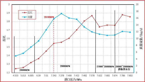近日,新工质发电团队完成了国内首台兆瓦级超临界二氧化碳压缩机样机的测试。压缩机首次实现全载测试运行,进口总压7.3~7.9MPa,进口总温305.4K,实验进口状态为超临界态,且在临界点附近,压缩机运行稳定;压缩机出口总压最高达到14.9MPa,总压比约1.9,流量达到12~17 kg/s,等熵绝热效率70~80%。实验结果显示,压缩机等熵效率、工作边界、间隙泄漏量等与理论设计基本相符,从而实现了第一次对超临界二氧化碳压缩机气动设计理论和方法的验证。