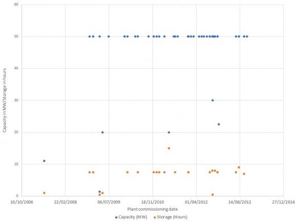 图:根据电站投运日期的西班牙光热电站和储能容量(蓝点为容量,黄点为储能小时数)资料来源:New Energy Updat