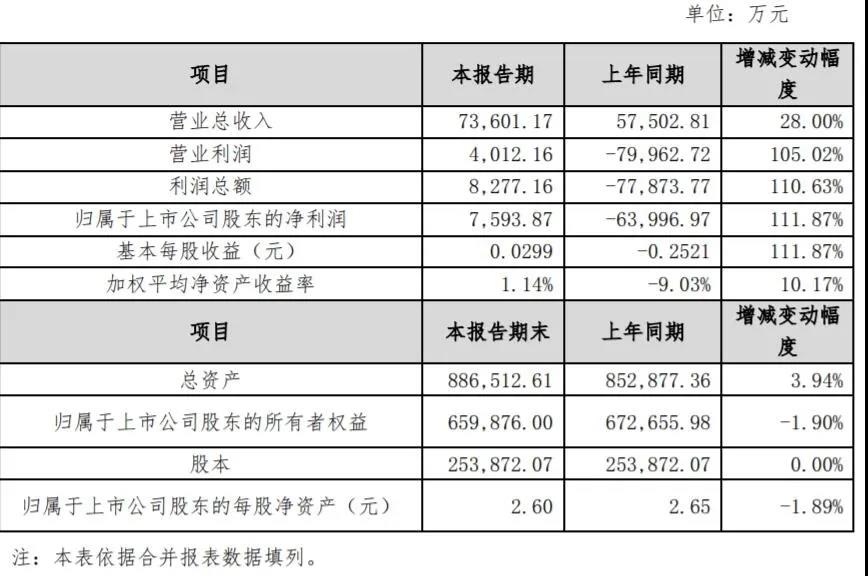 报告期末,公司总资产886,512.61万元,同比上升3.94%,归属于上市公司股东的所有者权益659,876.00万元,同比下降1.90%。