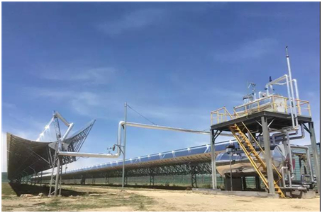 2016年,龙腾光热与德国瓦克化学联合开展了新一代导热油槽式集热系统示范项目,将一条600m标准槽式集热回路中的导热油替换为硅油,改造后的系统进入425℃的长期高温运行状态,成功实现了导热油系统从390℃到425℃的全球领先突破。2017年9月该系统获得国际能源署太阳能热发电和化学能组织颁发的“SolarPACES 2017技术创新奖”。在此基础上,中国可再生能源规模化发展二期项目对“基于硅油介质的槽式太阳能高温集热管的关键技术研发”进行了支持。项目重点开展了适用于430℃集热管的选择吸收膜层技术、集热管相关结构优化技术及其真空获得与长寿命维持技术,通过技术提升,满足该硅油电站对集热管在耐高温、高压、真空获得与长寿命维持及其结构可靠性等方面的技术要求。