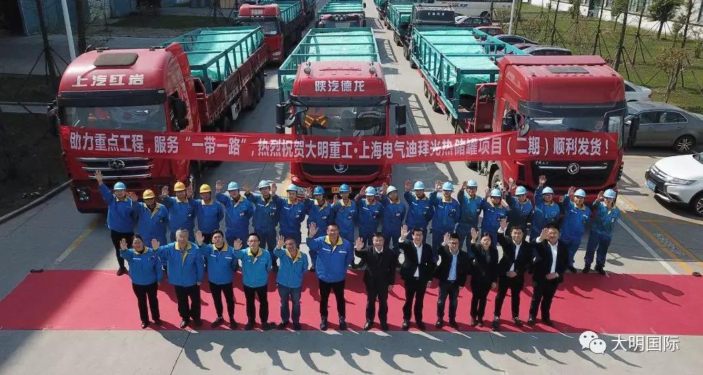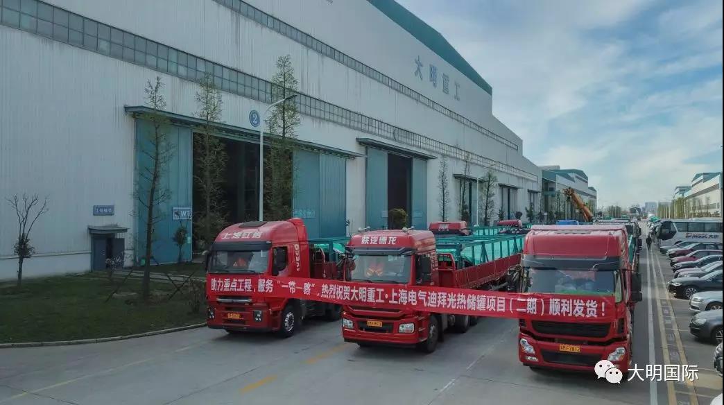 3月23日,由大明重工有限公司(下文简称大明重工)承制的为上海电气迪拜700MW光热和250MW光伏太阳能电站(二期)项目配套的光热储罐预制钢板首批发货。