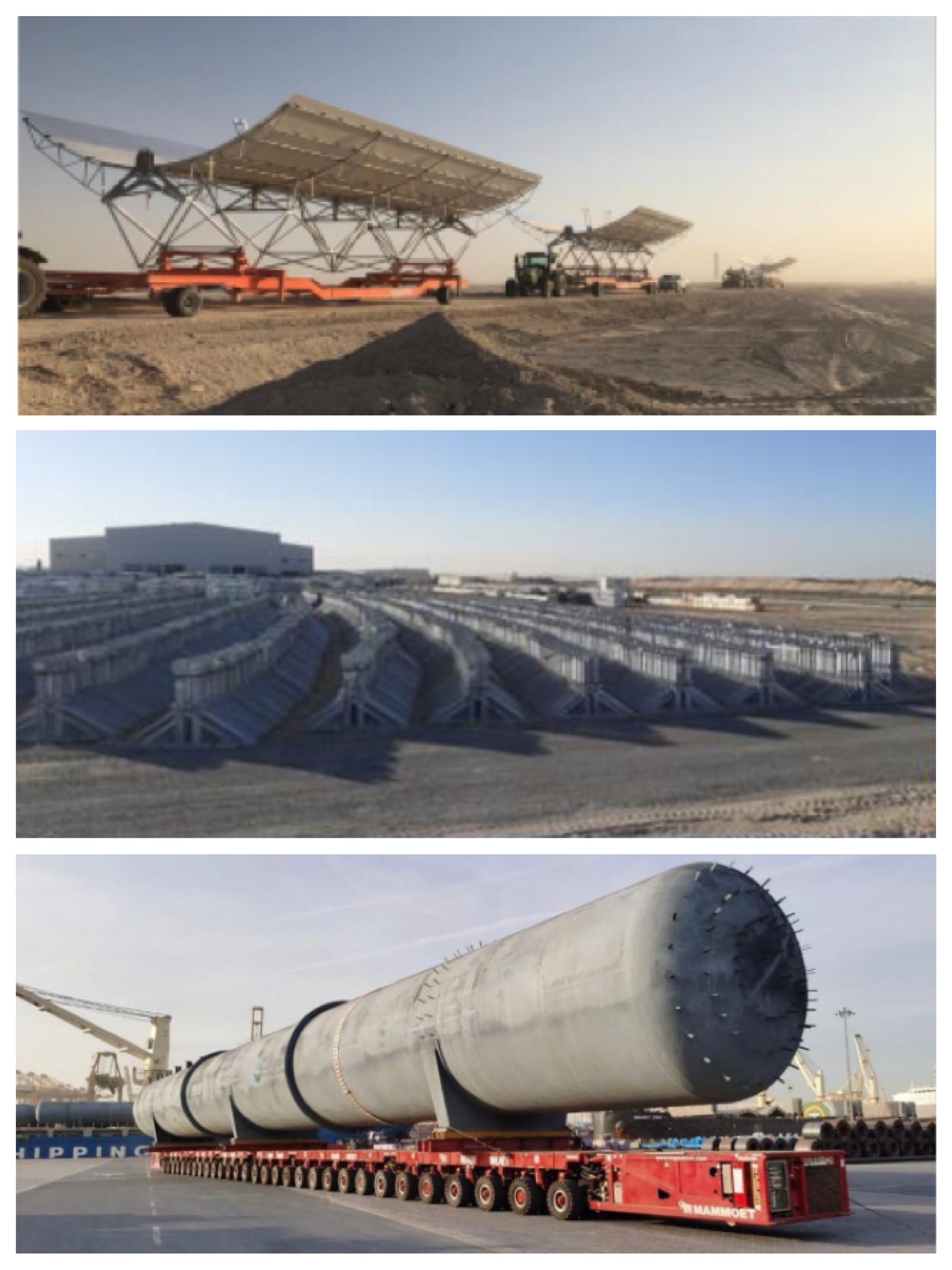三座槽式电站的基础设计工作已基本完成,第一个槽式电站PT1工程设计已完成。槽式电站反射镜总面积超过800万平方米,钢结构支架总重超过15万吨,吸热管数量达25万支,导热油总量超55000吨;所设计的管道直径为1.6米,高温导热油传输管道总长超过195公里,线路总长3400公里。当地时间3月27日,槽式PT1区域首台溢流罐顺利吊装就位,计划布置9台。作为导热油系统中重要的容器储存设备,单台溢流罐长52米,净重200多吨,是目前项目最大的单体运输件。