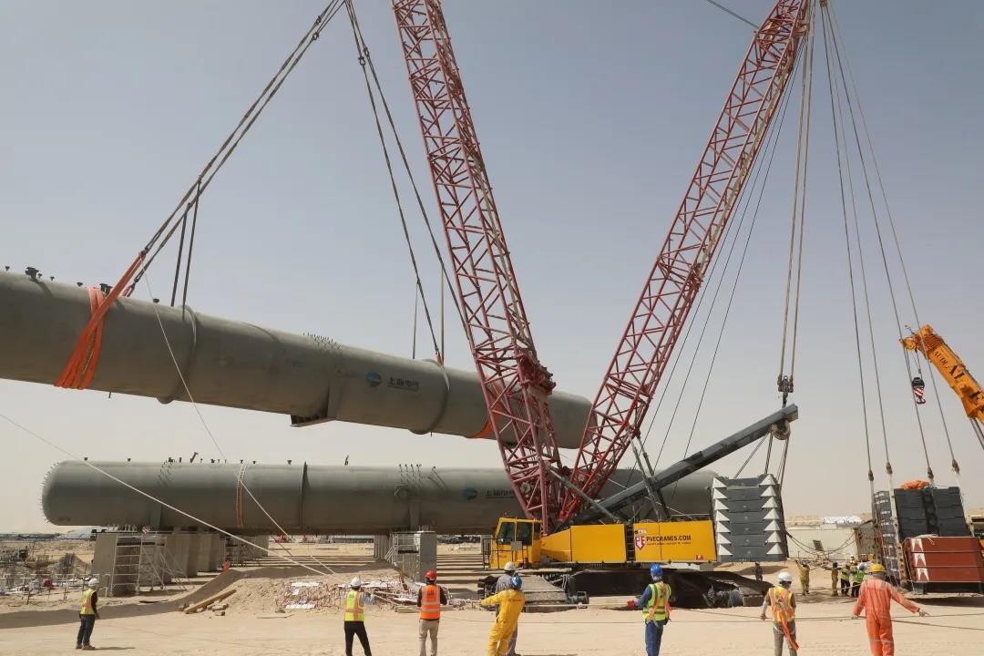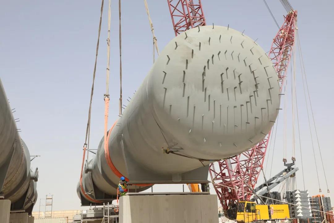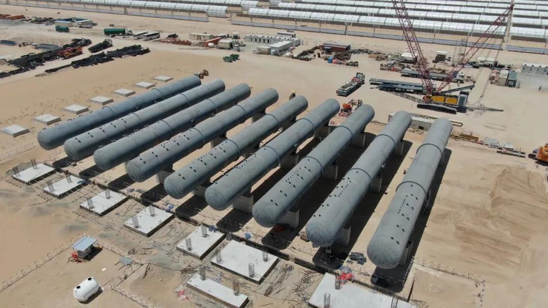这是上海电气迪拜光热项目现场在坚持疫情防控的同时,克服了因政府疫情管控对设备运输造成的不利影响,圆满完成了全部9台溢流罐吊装任务,为1号区域施工推进奠定基础。