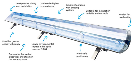 图:Absolicon T160集热器示意图,工业过程用热中太阳能蒸汽温度到160°C