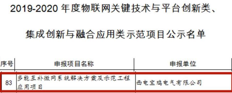 近日,中国西电集团多能互补微网系统解决方案及示范工程应用项目正式被国家工信部列入2019-2020年物联网关键技术与平台创新类、集成创新与融合应用类示范项目名单。